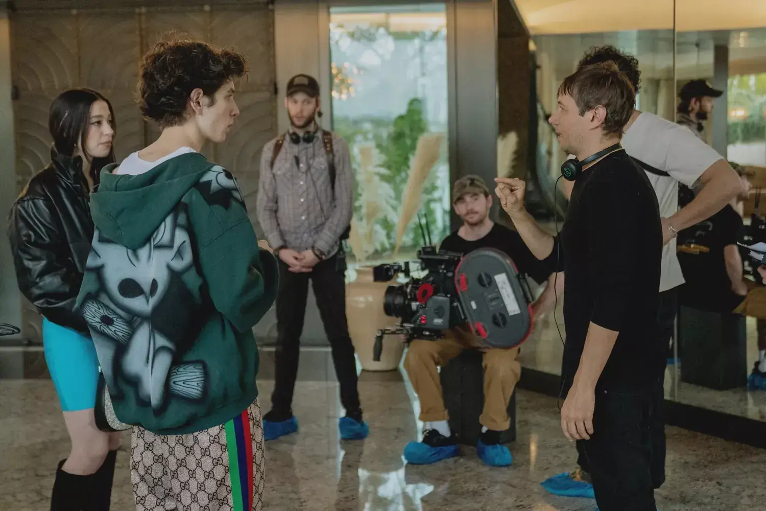 Sean Baker (right) directs stars Mikey Madison and Mark Eydelshteyn on the set of 'Anora'.