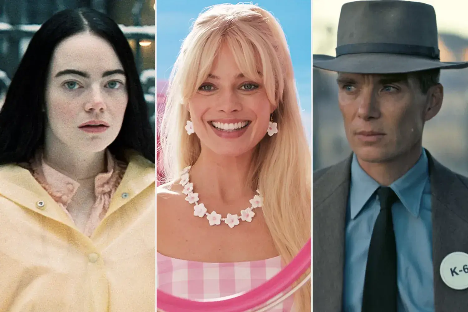 Emma Stone in 'Poor Things' ; Margot Robbie in 'Barbie' ; Cillian Murphy in 'Oppenheimer'.