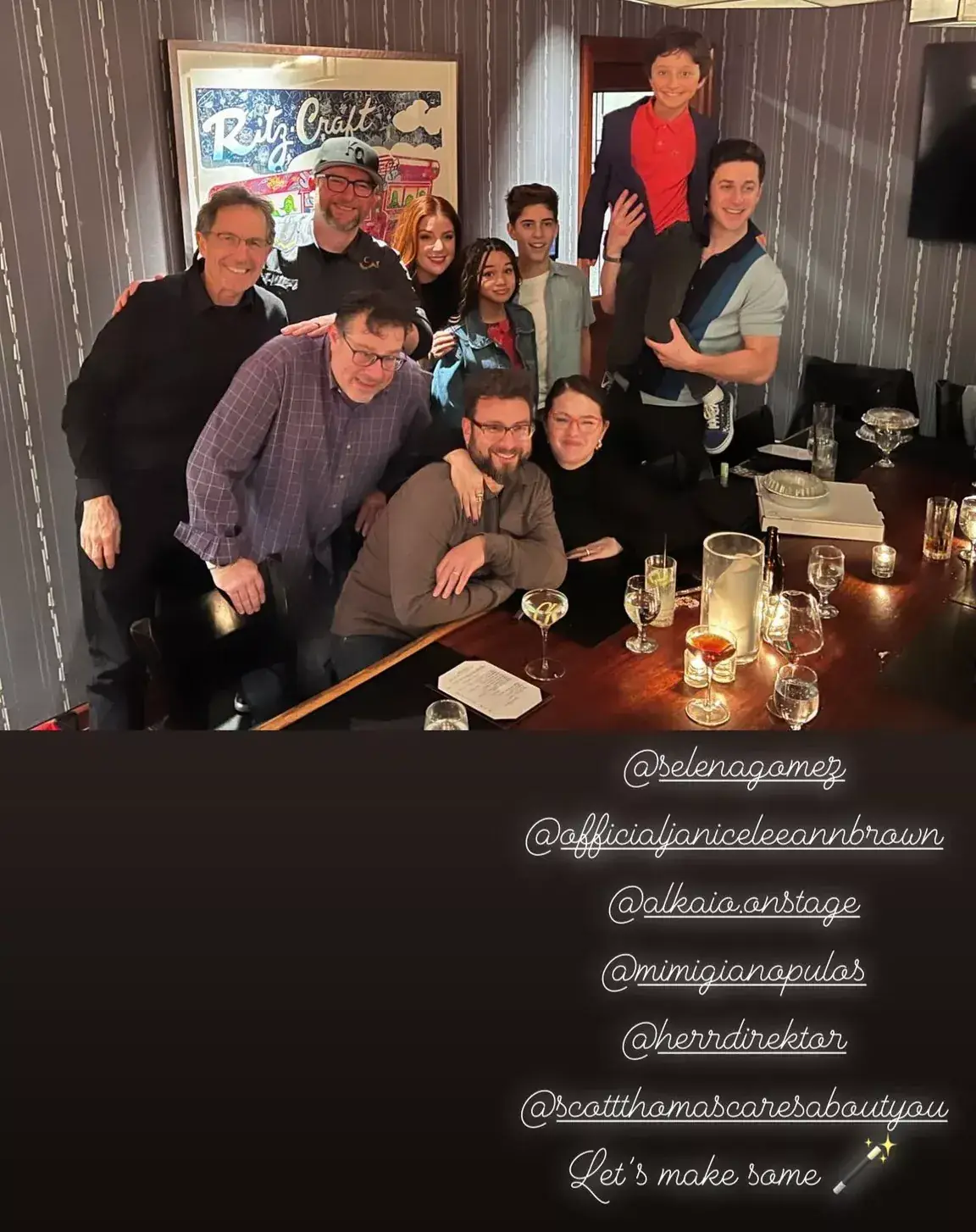 David Henrie reposted a photo of himself with Selena Gomez and other cast members from the recently-announced Wizards of Waverly Place revival, including Alkaio Thiele, Janice Brown, and Mimi Gianopulos on Monday. “Let’s make some [magic wand emoji],” Henrie wrote in his caption. Writer/producer Scott Thomas and director Andy Fickman can also be seen in the photo.
