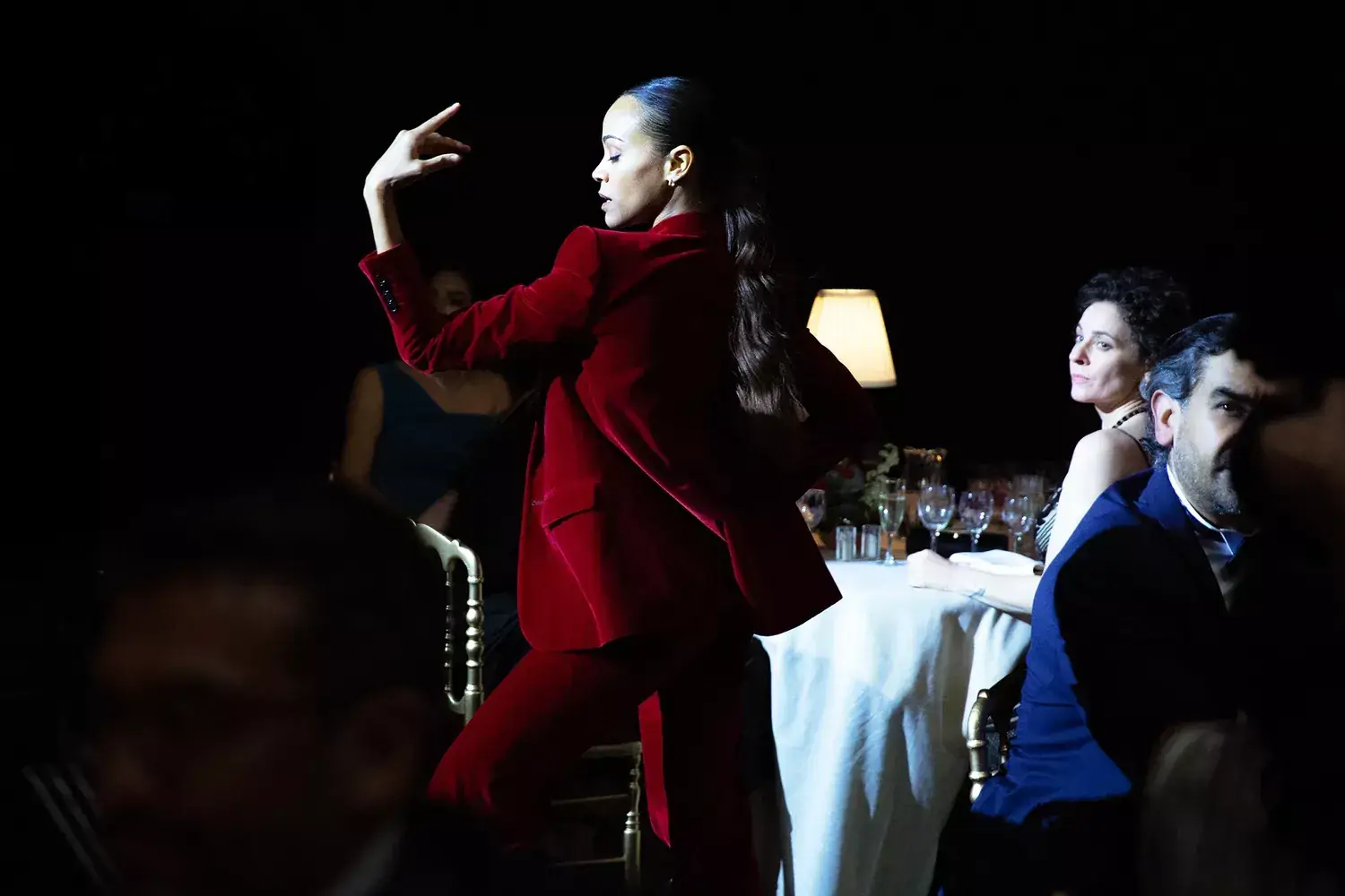 The core trio of women here give fabulous performances. It's a delight to see Saldana return to her dancing roots, and she executes Damien Jalet's choreography with a fierce precision. Saldana particularly shines in a number titled "The Bad," in which Rita lets loose about the criminals she and Emilia are getting in bed with, exorcising her frustrations in her imagination by jumping on tables and dancing with an energetic fury.