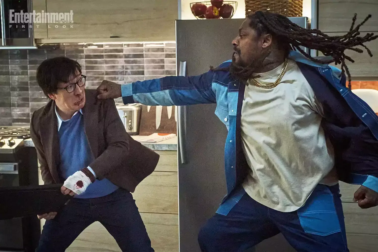 A fan of classic Hong Kong action films starring legends like Jackie Chan, Jet Li, and Sammo Hung, Quan was determined to follow in their footsteps by doing his own stunts. “I knew it was going to be intensive and really difficult, but I wanted to do it," Quan says. He'd return to his apartment on location in Manitoba, Canada, exhausted and bruised after a day’s work, which included throwing it down with former NFL star Lynch (there was “nothing more scary” than having a former running back coming at him in full speed, he quips) and martial arts icon Wu. “We really went at it,” he says of the latter. “I'm old school and so is he, and that's how we were taught to make a fight sequence look good. You can’t fake it.”
