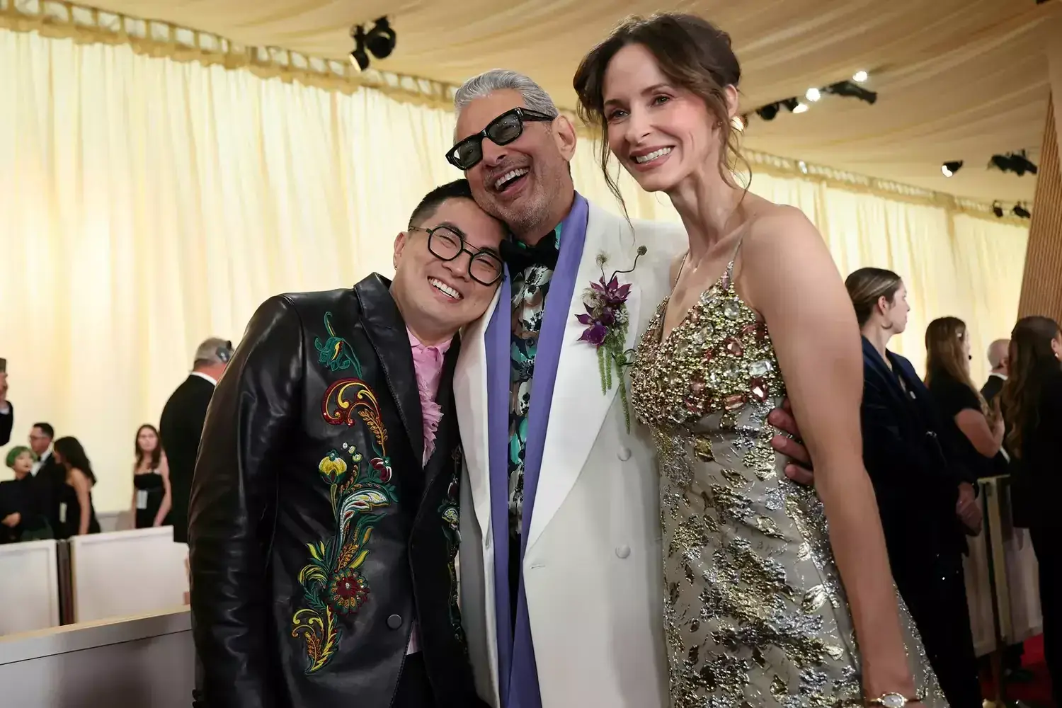 Bowen Yang, Jeff Goldblum, and Goldblum's wife, Emilie Livingston, at the Oscars.