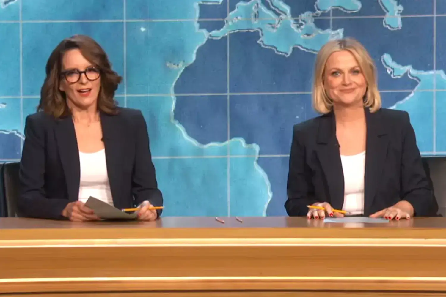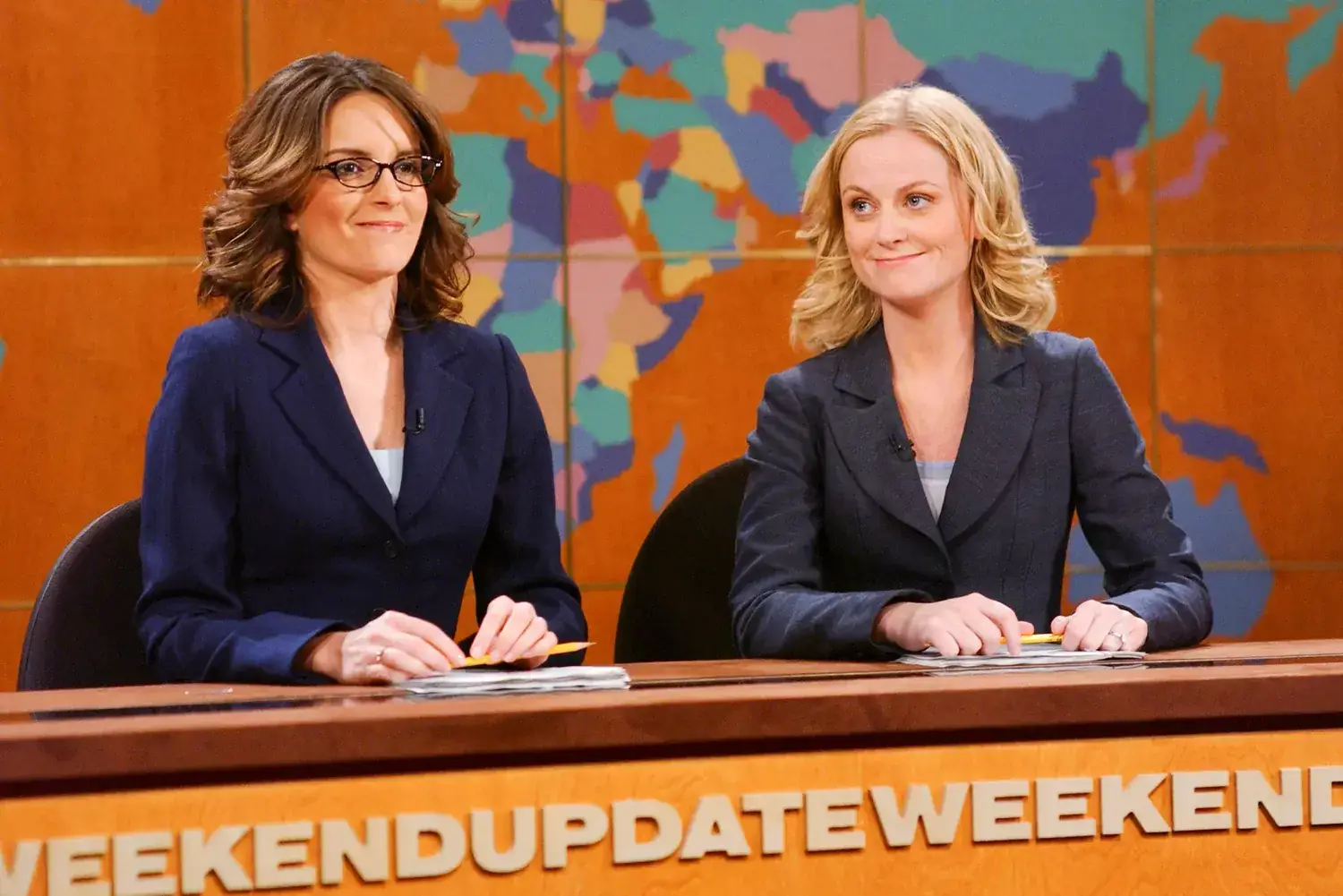 Tina Fey and Amy Poehler anchoring 'Weekend Update' on 'Saturday Night Live'.